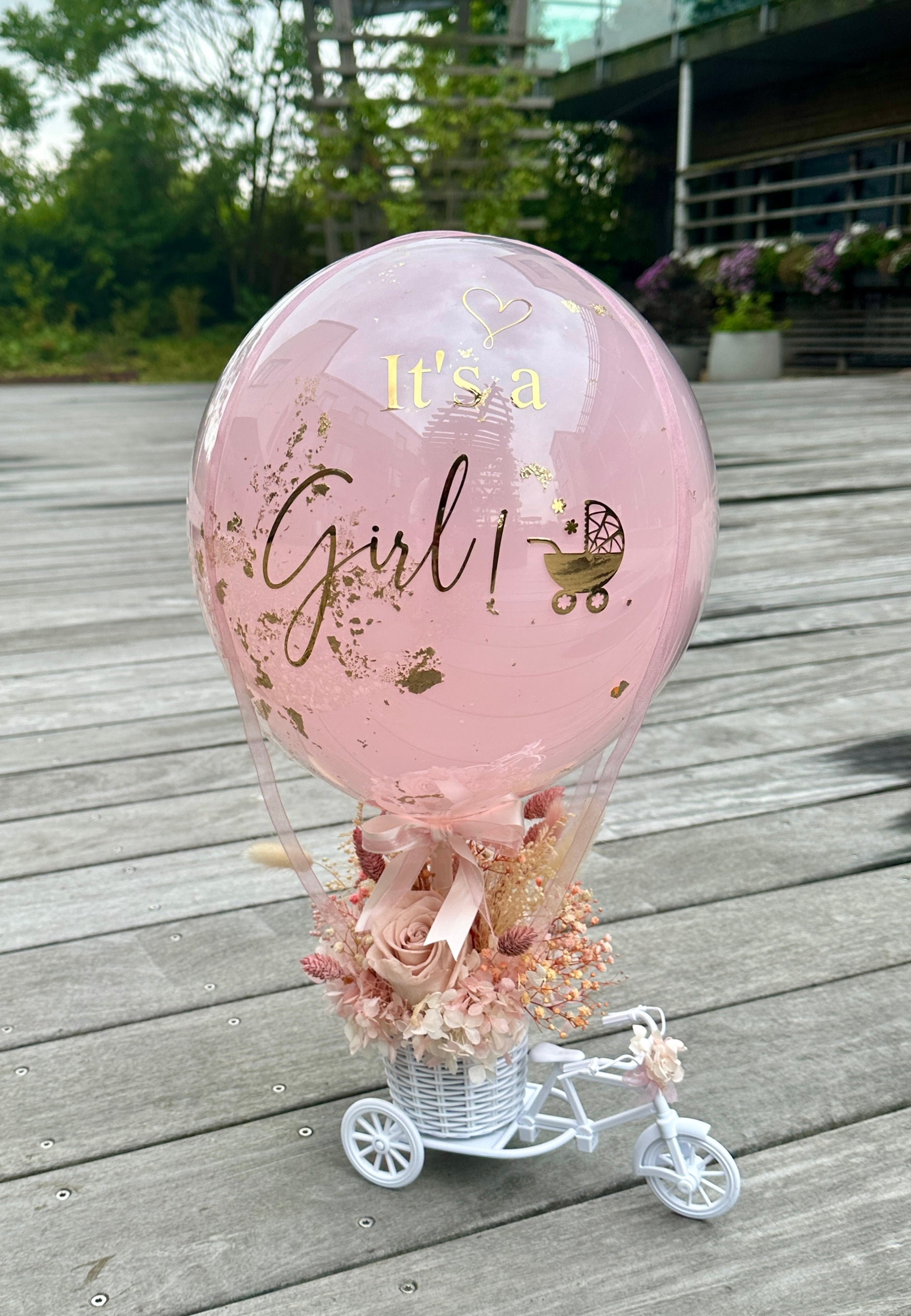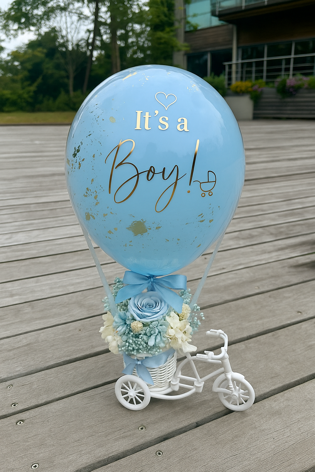 A charming design on a miniature white bicycle, filled with preserved flowers and topped with a balloon message. Whimsical, sweet and memorable.