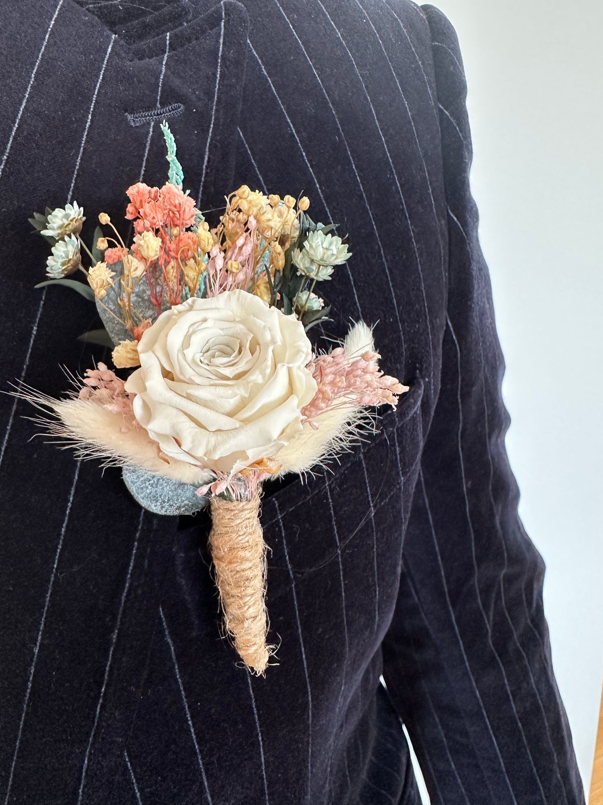 Every detail in a wedding tells a story, and the boutonniere is more than just an accessory, it is a symbol of honor, elegance, and connection to the essence of the celebration. Our “Eternal Distinction” boutonniere is crafted with preserved and dried flowers, carefully selected and handcrafted by Nordic Flowers by Lutín.