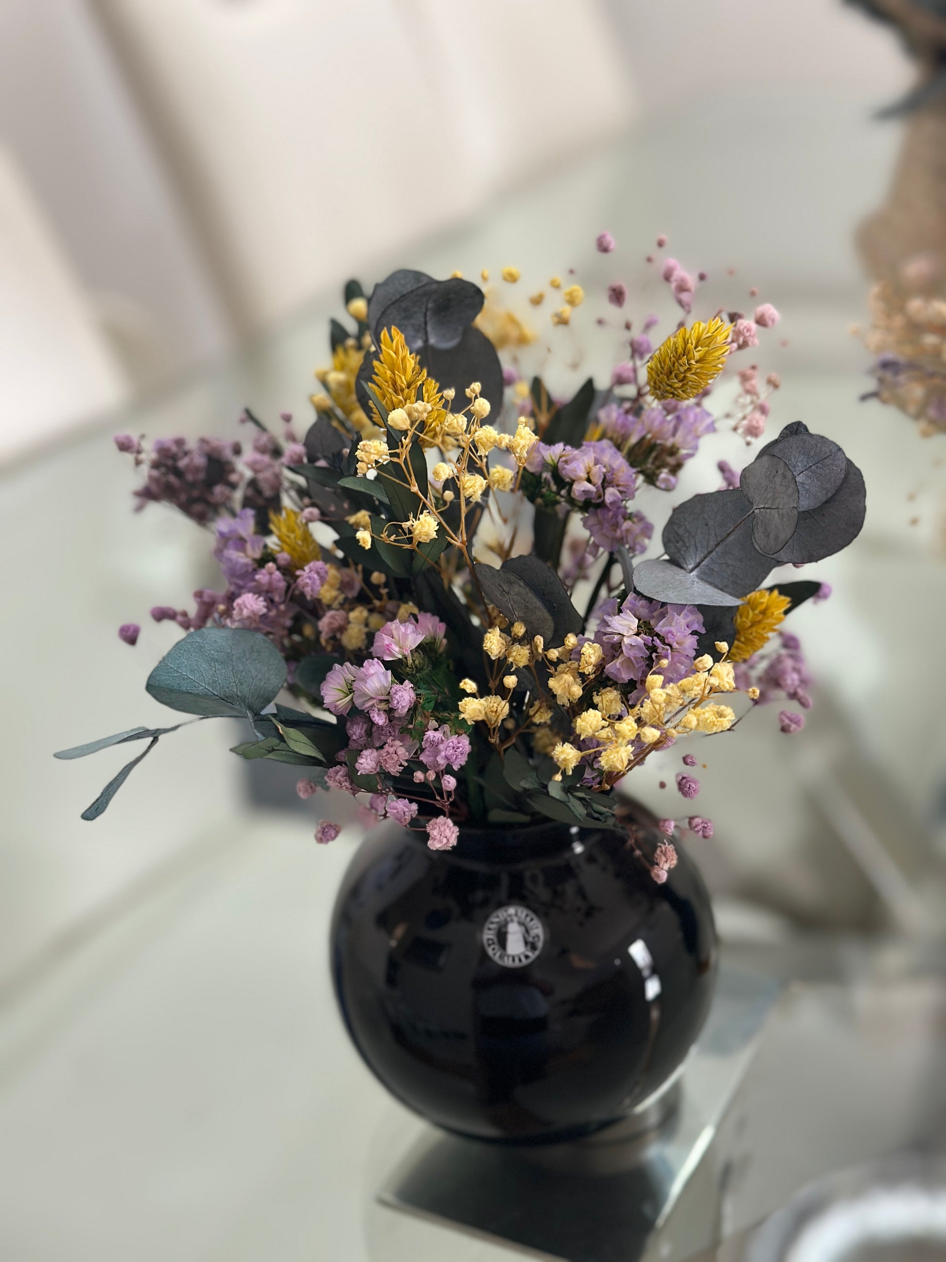 Lavender Sol is a poetic blend of preserved wildflowers designed to bring warmth and serenity into your space. Soft lavender tones dance alongside golden yellow accents and deep green eucalyptus, creating a striking contrast against the elegant black ceramic vase — a subtle nod to Nordic minimalism and natural beauty.