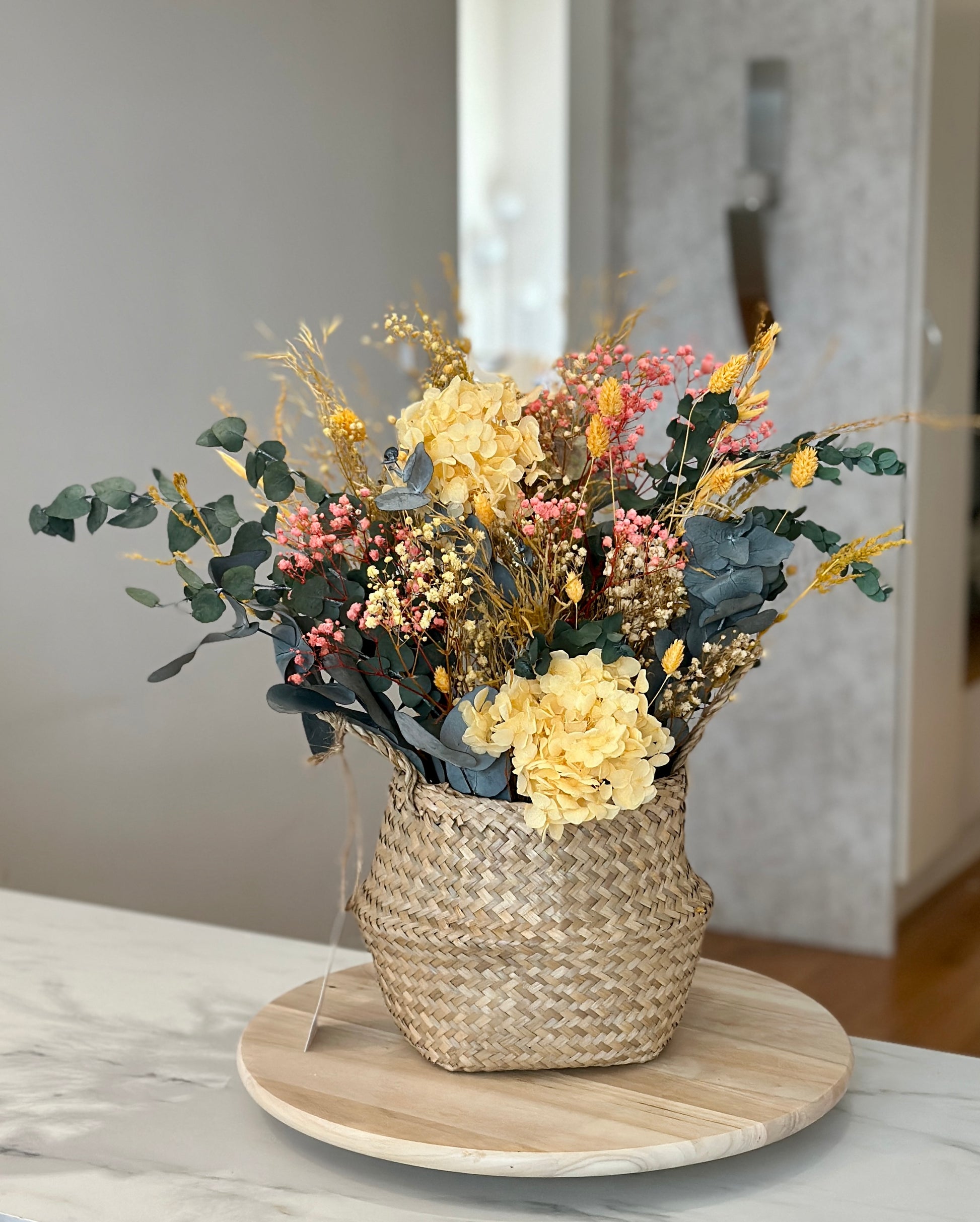 Nestled in a beautifully handwoven basket, this arrangement embodies Nordic minimalism, where simplicity meets sophistication. Its natural textures and organic composition make it a timeless piece, ideal for adding warmth and character to any interior.