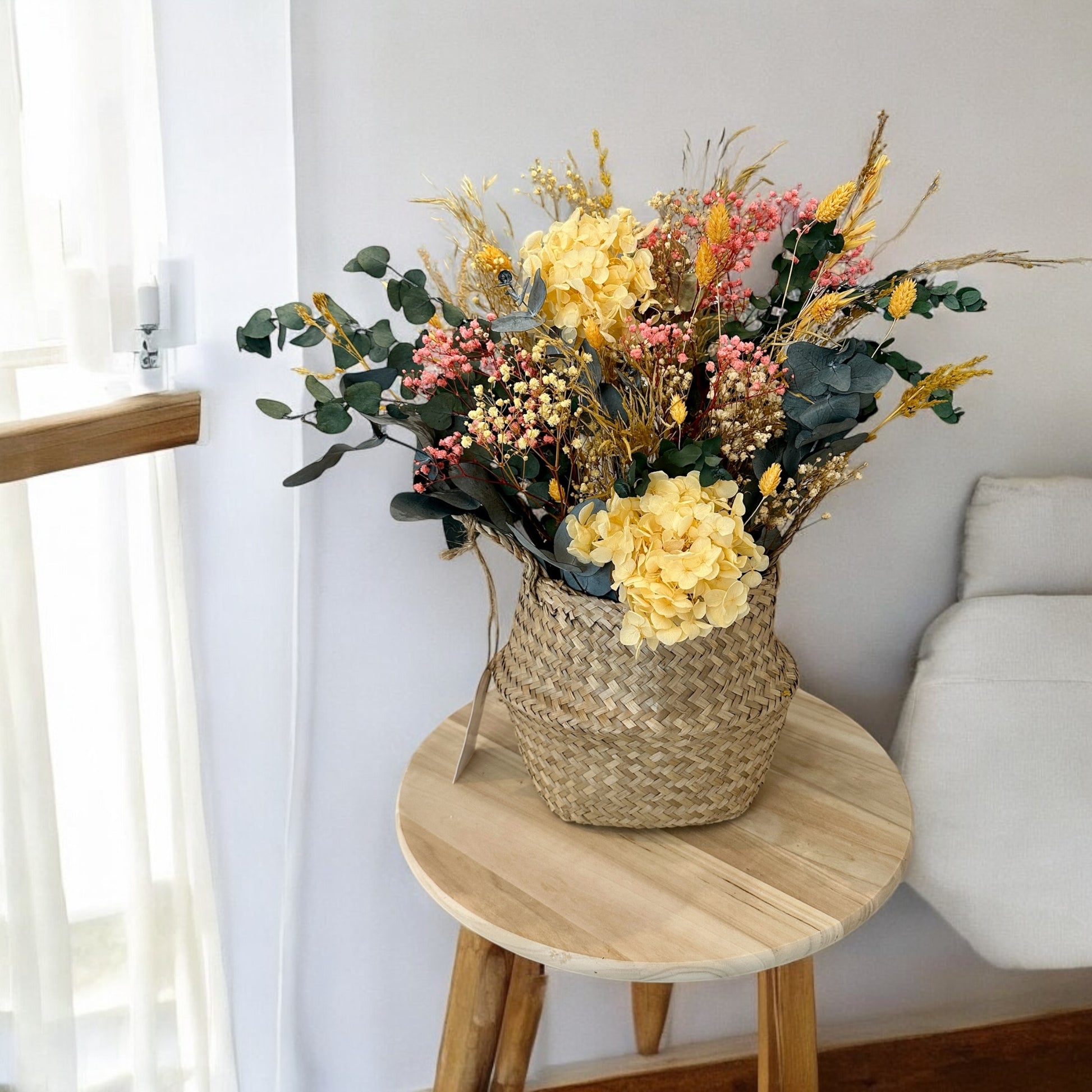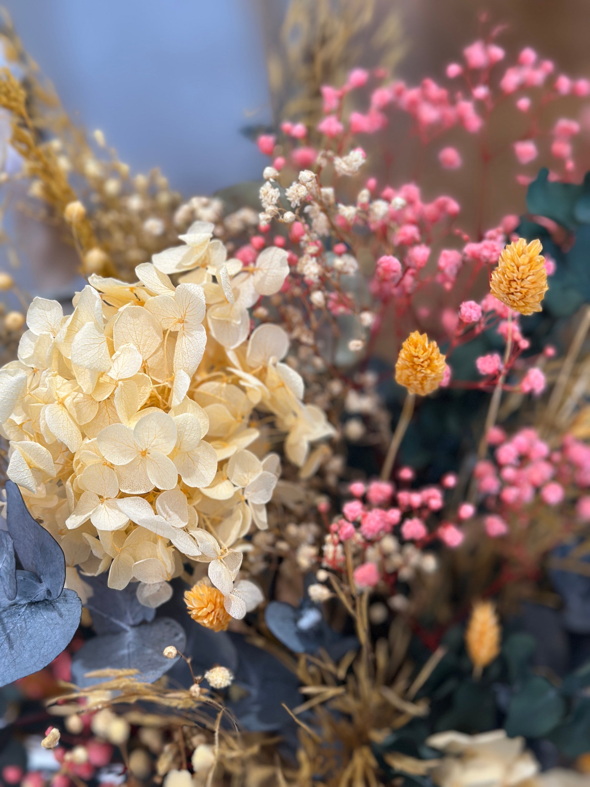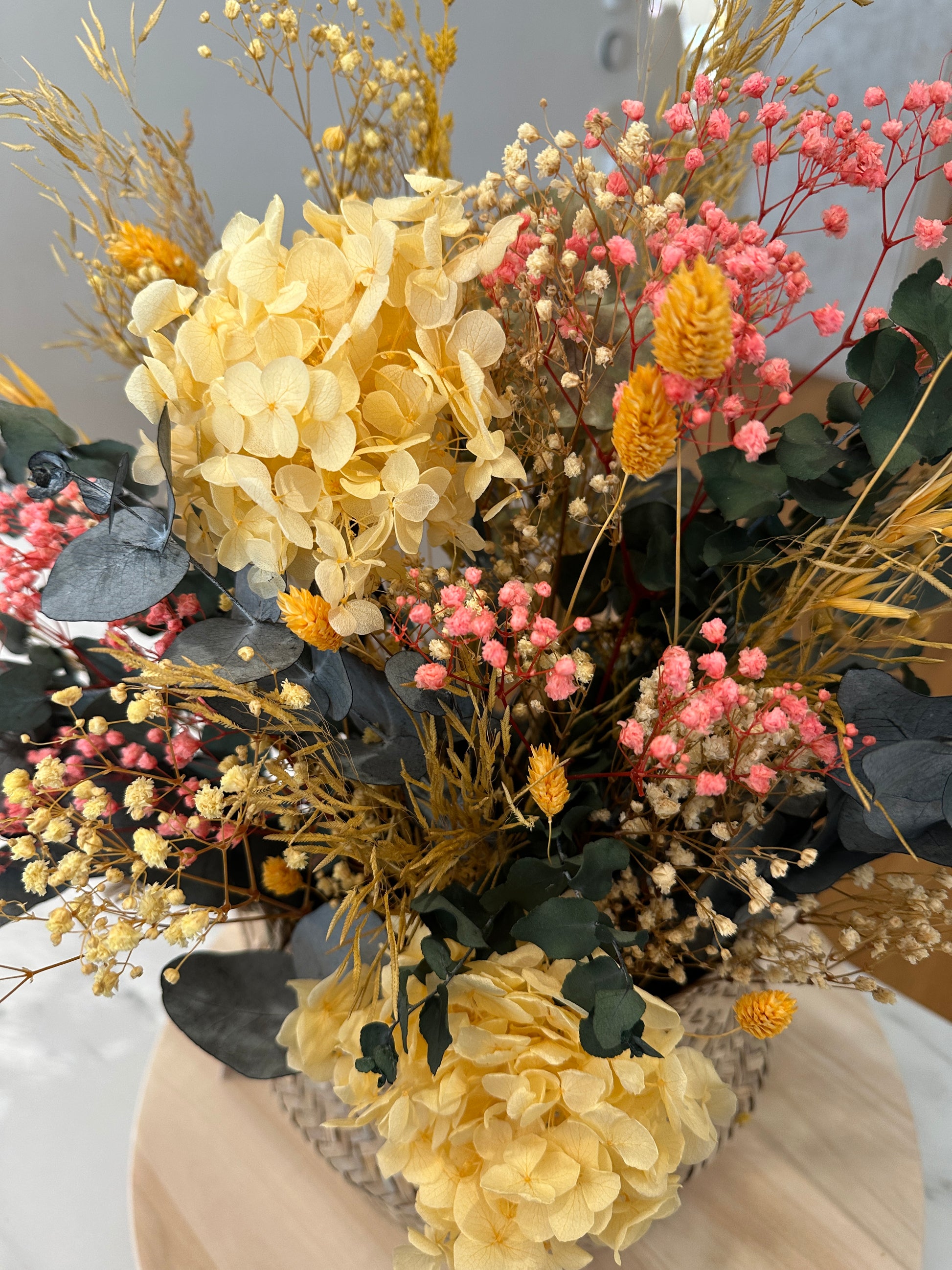 Immerse your space in the warmth of Sunny Meadow, a refined preserved floral arrangement that evokes the golden hues of a sunlit field. This exquisite bouquet combines the soft elegance of bridal veil (Gypsophila), the voluminous charm of hydrangeas, and the delicate texture of eucalyptus cinerea, harmoniously intertwined with pampas grass and other carefully selected dried flowers. Accents of soft pink add a subtle contrast, enhancing its depth and visual allure.
