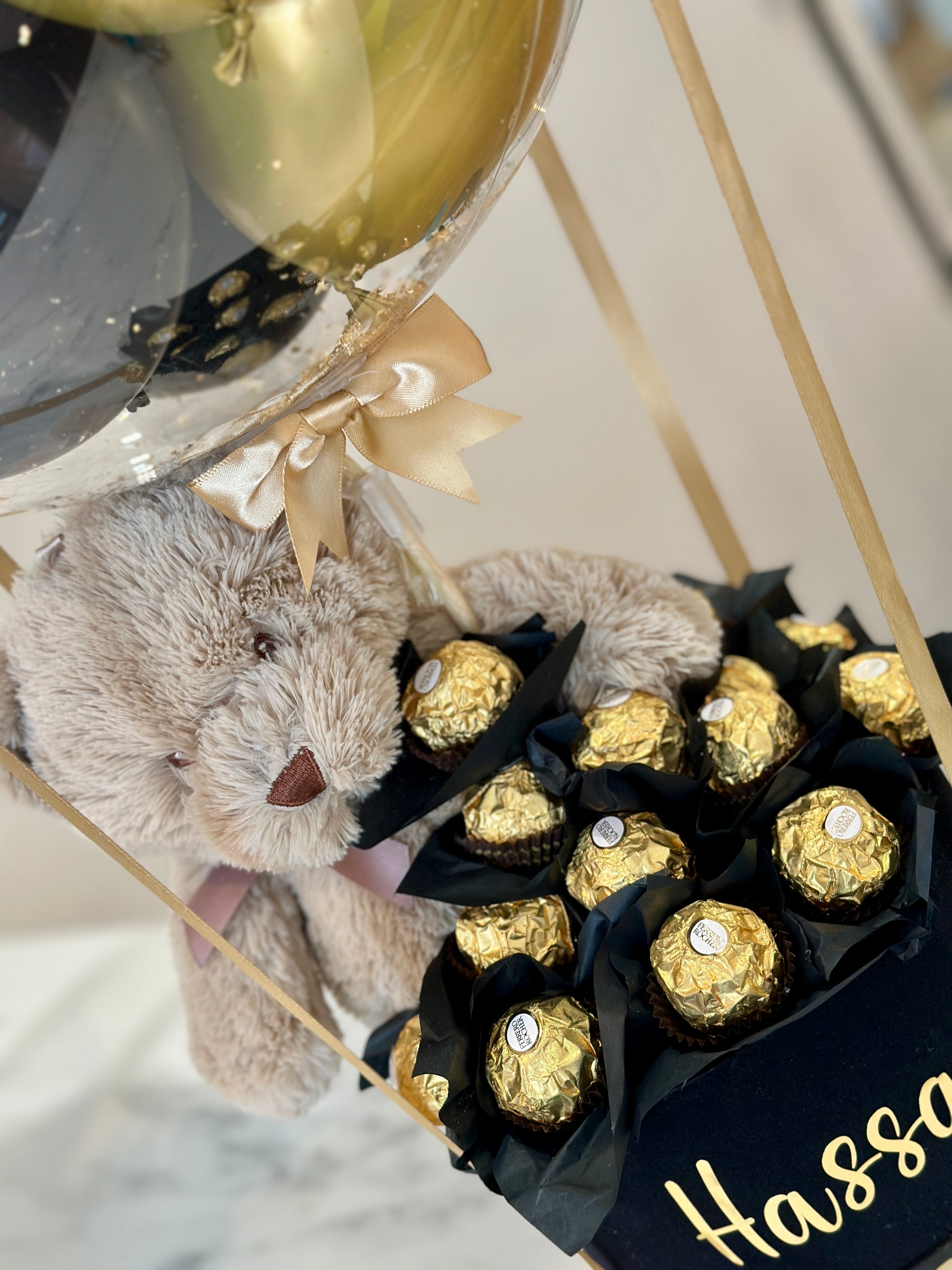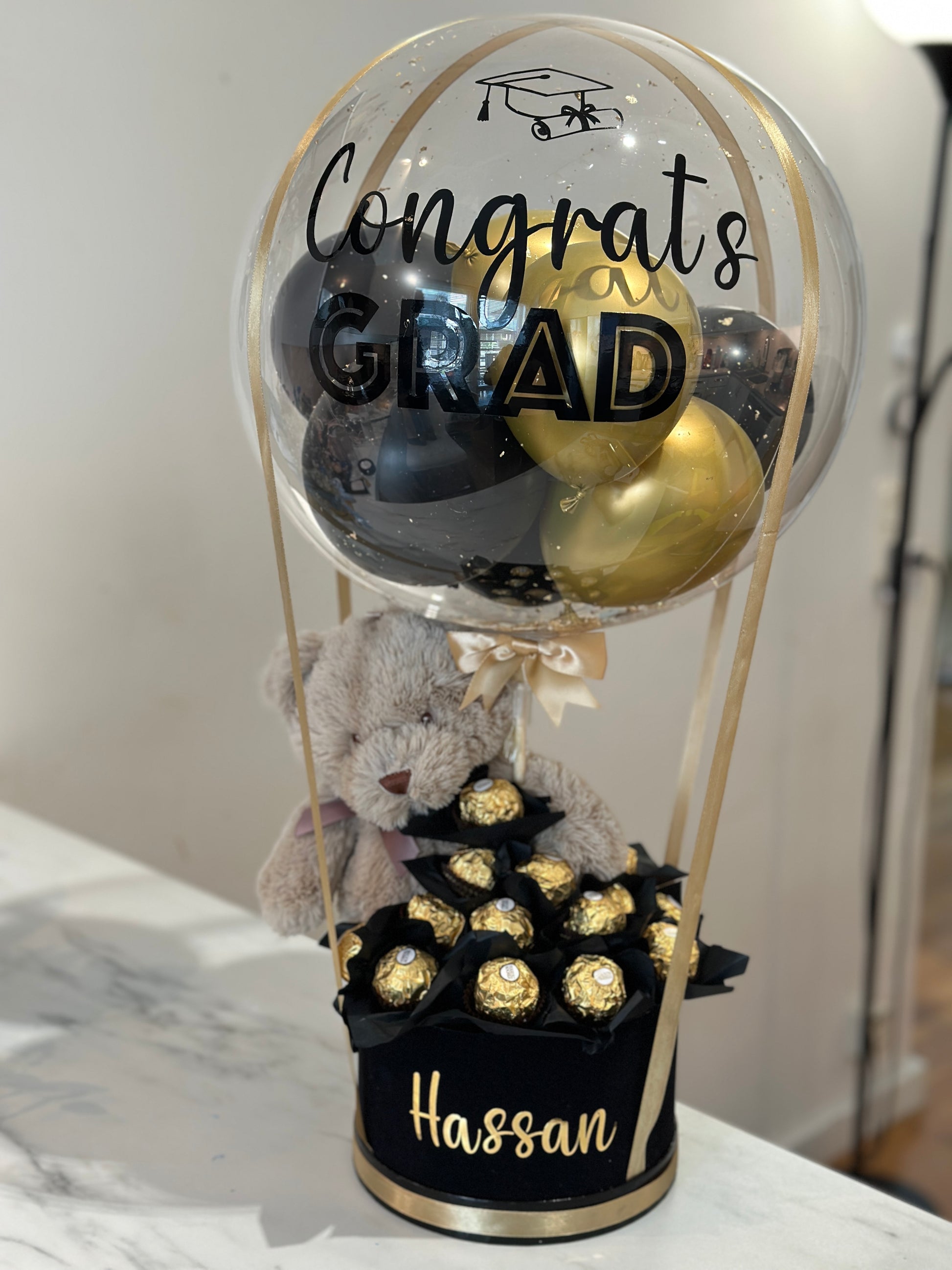 Celebrate a milestone in the sweetest way! This elegant graduation arrangement features a clear balloon filled with sleek metallic mini balloons, a soft plush teddy bear, and a circle of delicious Ferrero Rocher chocolates. Personalized with the graduate’s name, it’s the perfect gift to honor their hard work, success, and bright future ahead.