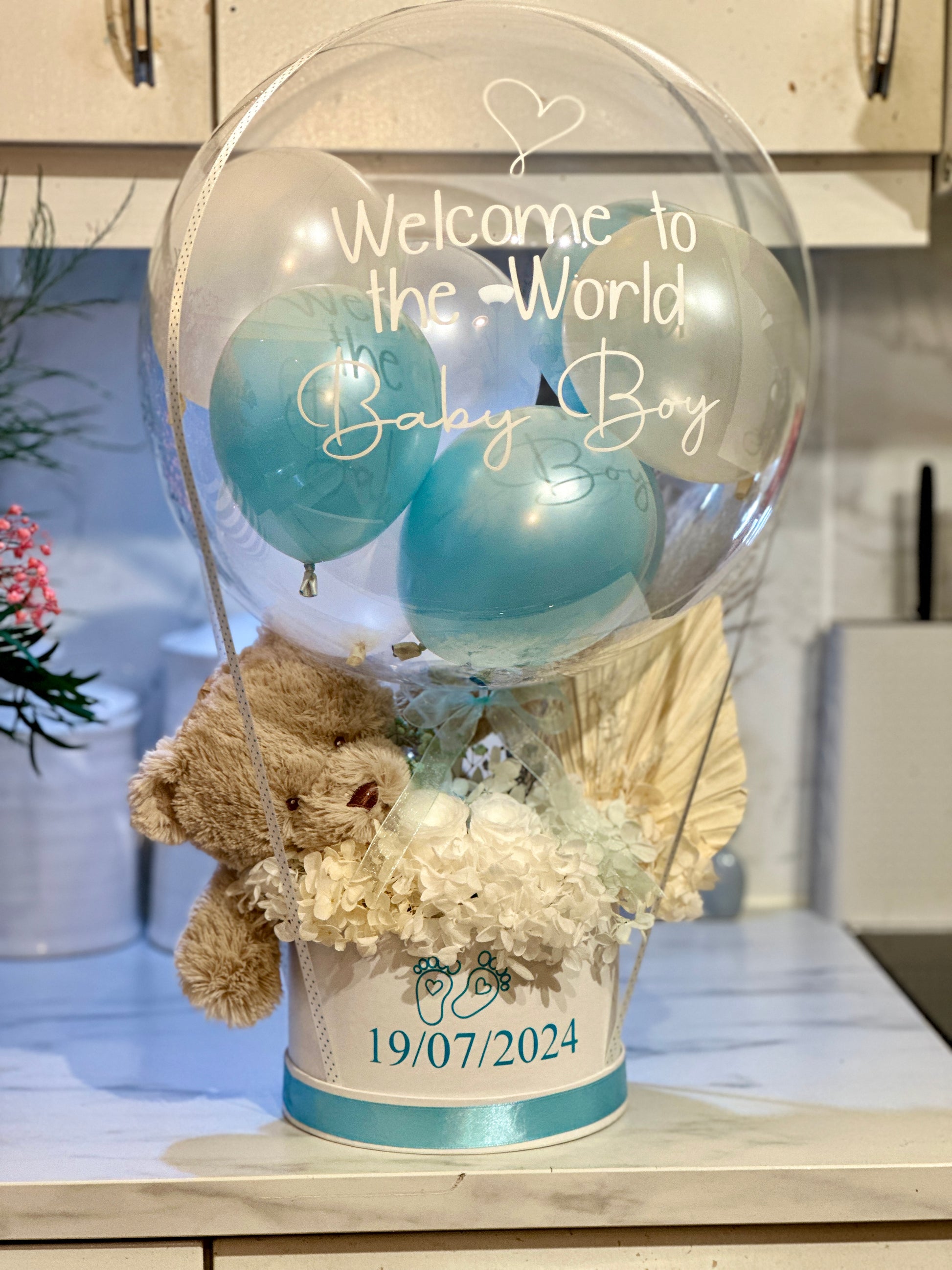 This elegant arrangement features a cuddly teddy bear surrounded by preserved florals in a pastel pink or blue palette. The transparent balloon displays a warm welcome message, making it an exquisite gift for a baby.