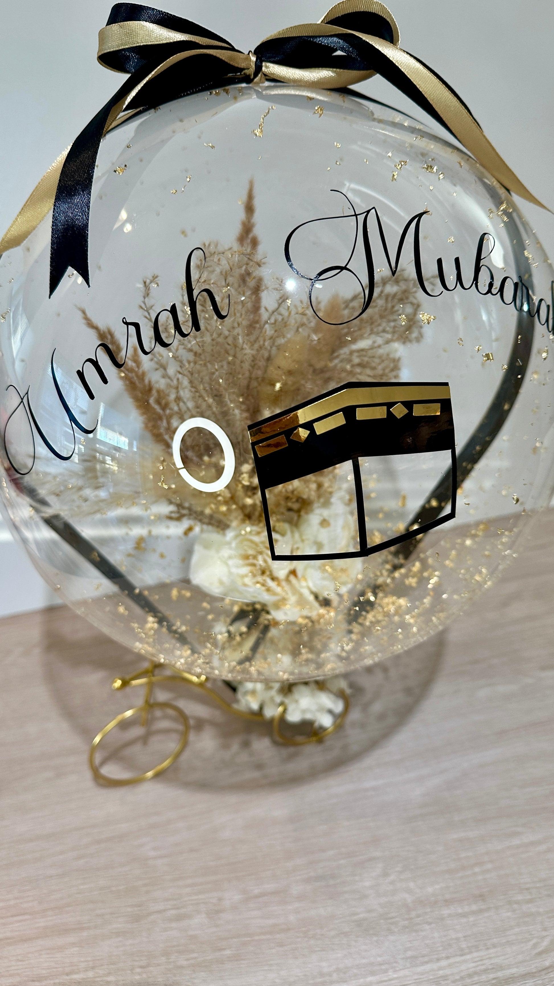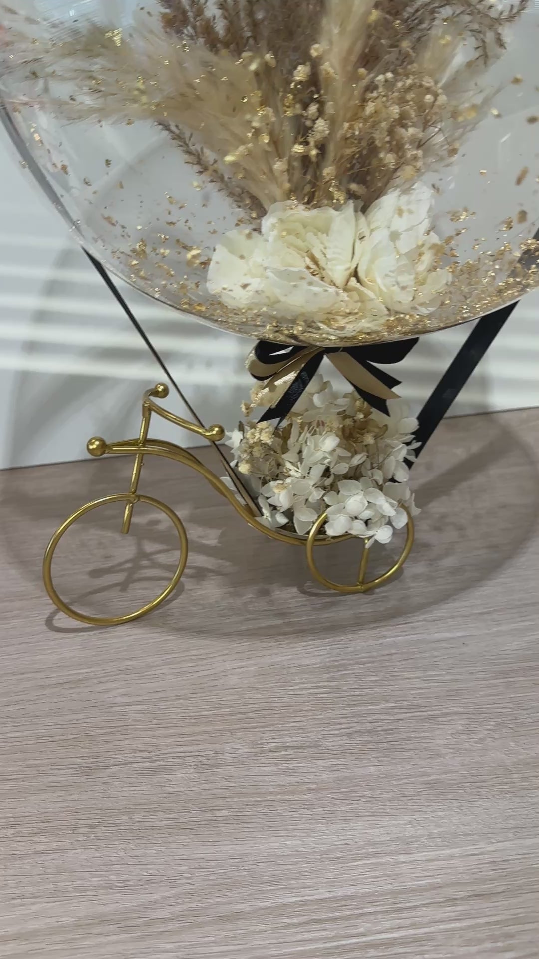 This exquisite balloon arrangement is a refined statement of elegance and timeless beauty, thoughtfully designed to complement any special occasion. The premium transparent balloon is delicately accented with soft gold flakes and finished with luxurious black and gold ribbons, creating a sophisticated and harmonious look.